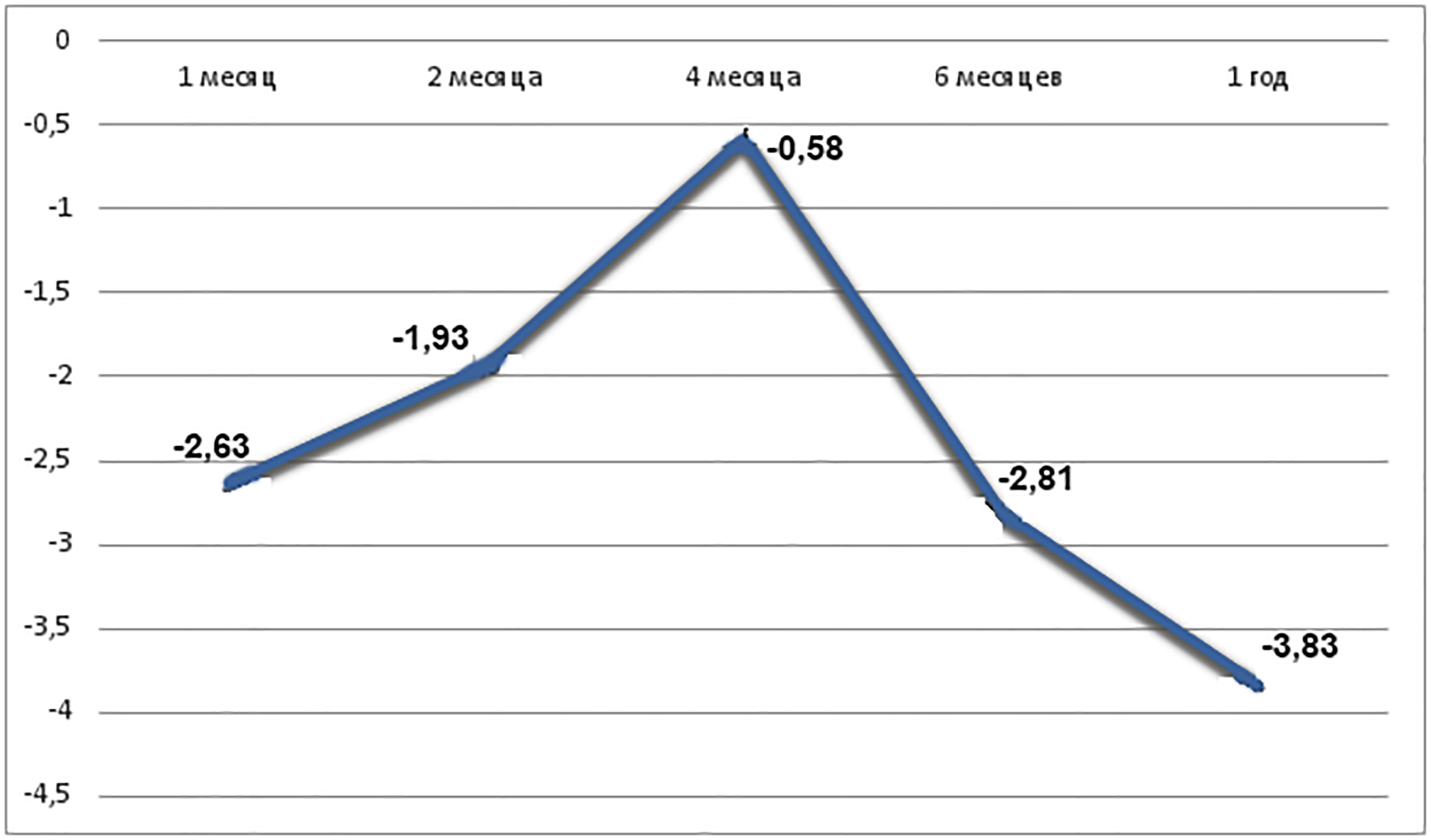 Показатели периотестметрических данных в зак- лючительном периоде наблюдения выявили снижение степени подвижности установленных имплантатов. Через полгода после имплантации показатели периотестметрии составляли (-1,71 ± 0,12), а через год (-3,22 ± 0,11). Полученные данные можно обосновать окончанием процесса перестройки костной ткани челюсти в результате вторичной стабильности (рис. 2).