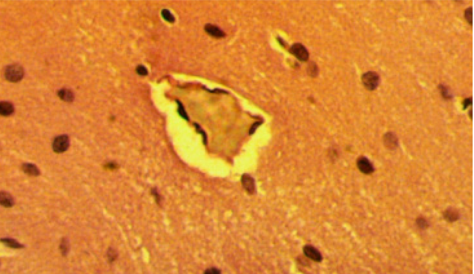 Моделировалась ЧМТ путем нанесения удара металлическим грузиком 68 г с высоты 90 см в теменно-затылочную область с помощью специального устройства. Энергия воздействия при этом составила 0,6 Дж. Через трое суток животных под наркозом выводили из эксперимента. Суправитально кровеносные сосуды части крыс инъецировали взвесью черной туши в 10%-м растворе нейтрального формалина в соотношении 1:4 через брюшную аорту. Затем проводилась декапитация, череп освобождался от мягких тканей и погружался в 10%-й нейтральный раствор формалина на 3 дня. Затем мозг с мозжечком извлекался из полости черепа, проводился по спиртам возрастающей концентрации, заливался в парафин. Из парафиновых блоков готовились гистологические срезы толщиной 5–7 мкм, окрашивались гемотоксилином-эозином и пирофуксином по Ван-Гизону. Готовые препараты изучались под микроскопом OlympusB×40 (Япония). Одновременно проводились серийное микрофотографирование с помощью цифрового фотоаппарата, сопряженного с оптической системой микроскопа и компьютером, морфометрия и протоколирование результатов.