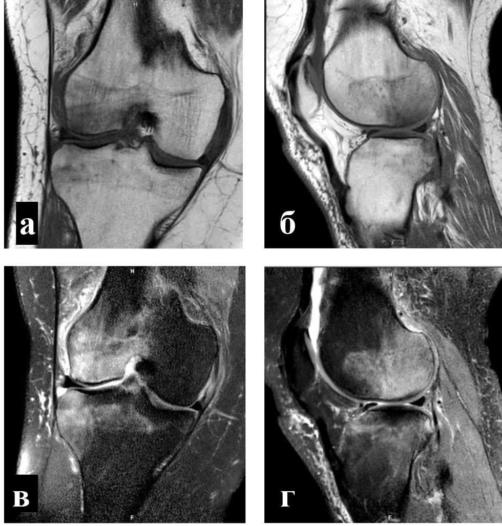 Для определения локализации и распространенности перегрузочного отека костного мозга всем пациентам выполняли МРТ. На Т1-взвешенных изображениях визуализировали снижение интенсивности сигнала, на Т2-взвешенных изображениях с жироподавлением и на коротких последовательностях «восстановления – инверсии» (STIR) выявляли высокую интенсивность сигнала (рис. 1).
