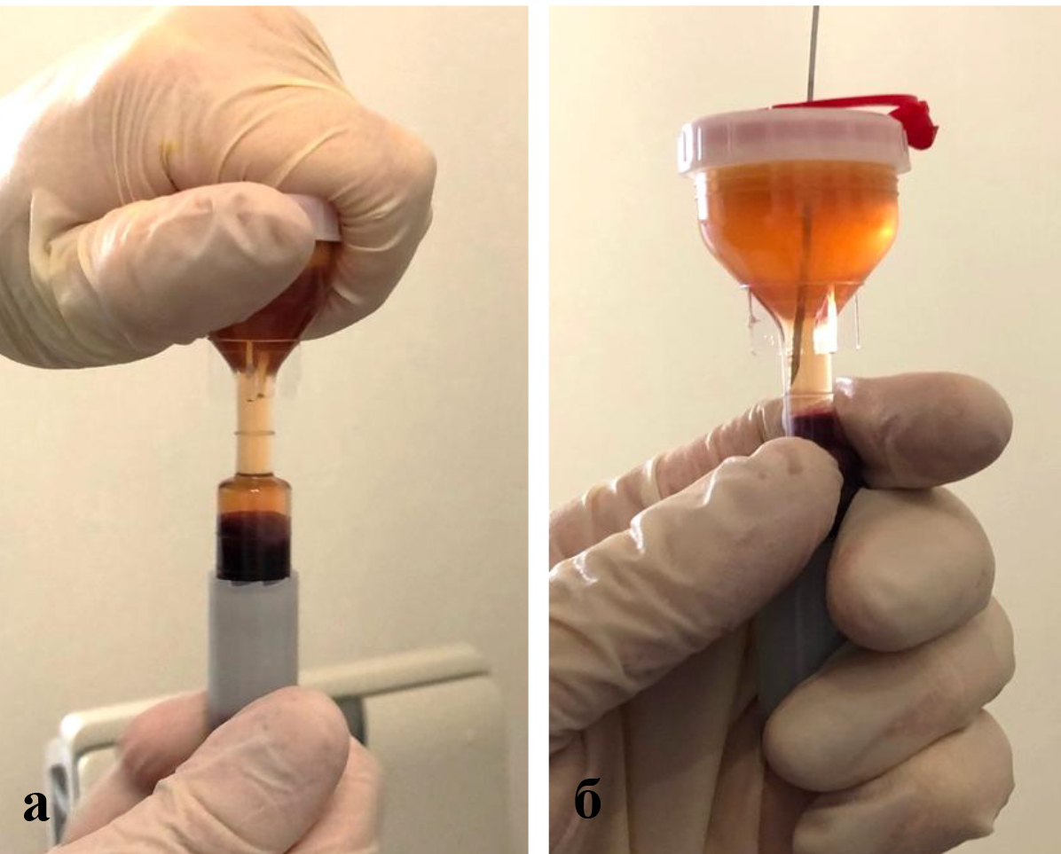 Техника подготовки препарата и инъекции. Забор крови и приготовление ОТП выполняли в условиях процедурного кабинета или перевязочной при соблюдении необходимых правил асептики и антисептики. Согласно методике YCELLBIO PRP (Корея), двухкратно центрифугировали кровь пациента и получали 3 мл ОТП, которую центрировали в узком перешейке пробирки и забирали при помощи шприца (рис. 2) Количество тромбоцитов в готовом препарате составляло 962 ± 40 × 109/л.