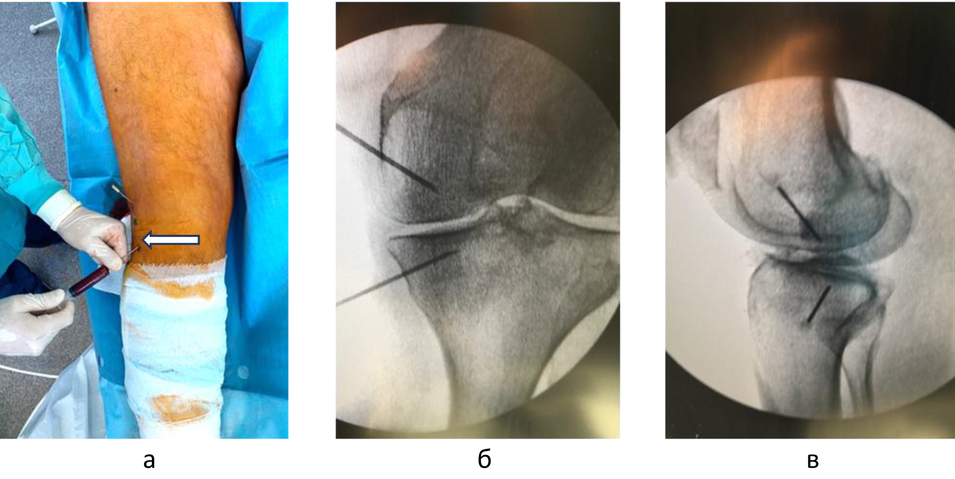 Внутрикостные инъекции ККМ и ОТП выполняли в условиях операционной. Используя 2%-й раствор лидокаина, инфильтрировали мягкие ткани по внутренней или наружной поверхности коленного сустава на 2 см проксимальнее и на 2 см дистальнее уровня суставной щели. Троакары вводили в кость вкручивающими движениями под углом 45 градусов по отношению к оси конечности и продвигали на глубину 1,5 см, достигнув субхондральных структур. Позиционирование троакаров оценивали с помощь электронно-оптического преобразователя (ЭОП) в 2 стандартных проекциях (рис. 3).