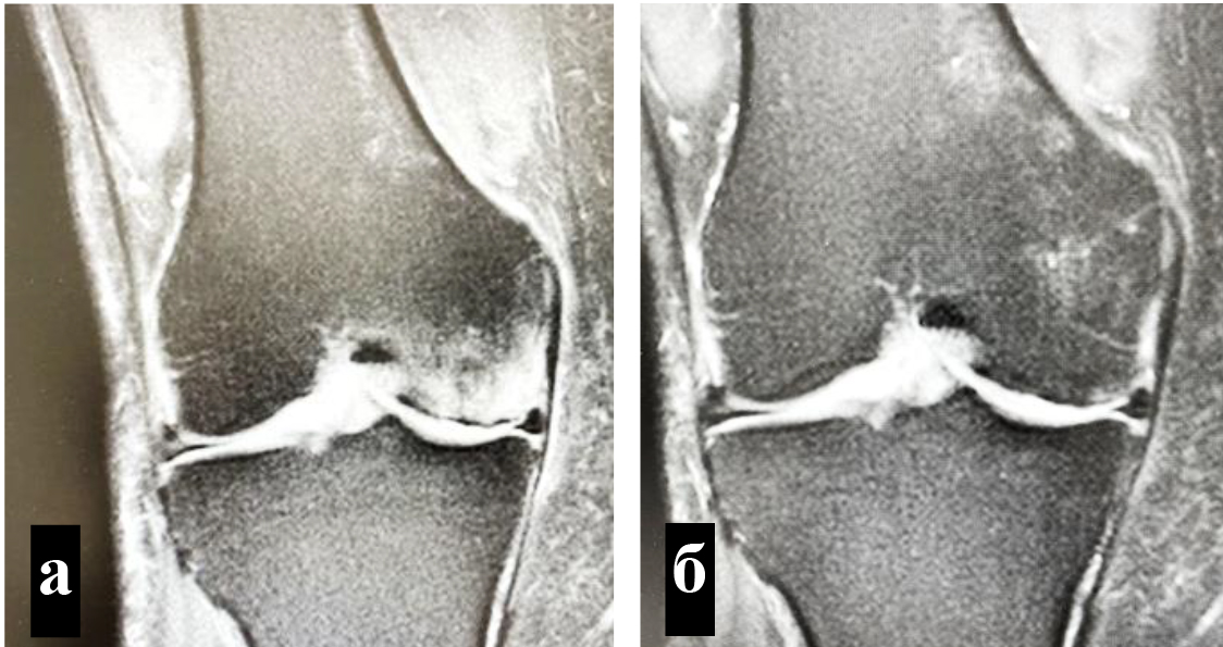 Объективным показателем регресса болевого синдрома и нормализации клеточного метаболизма субхондральных структур являлось значительное сокращение объема или вовсе исчезновение зон трабекулярного отека костного мозга, что подтверждалось уменьшением гиперинтенсивных участков по данным МРТ (рис. 4) [8].