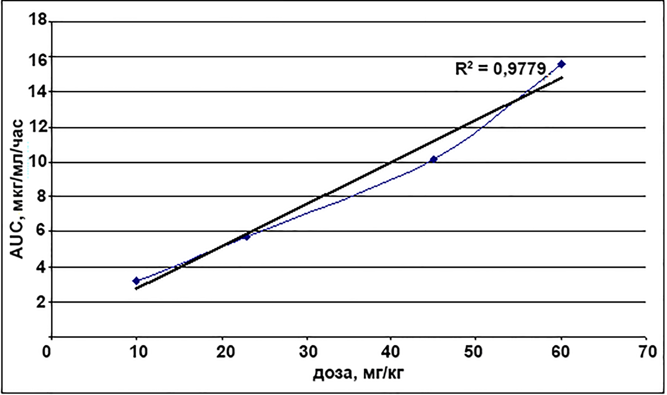 На основании полученных данных был рассчитан параметр AUC (площадь под кривой) и построен график зависимости между вводимой дозой данного соединения и площадью под фармакокинетической кривой (рис. 1). Полученный график подтвердил наличие линейной зависимости между данными параметрами (коэффициент аппроксимации R2 = 0,9779).