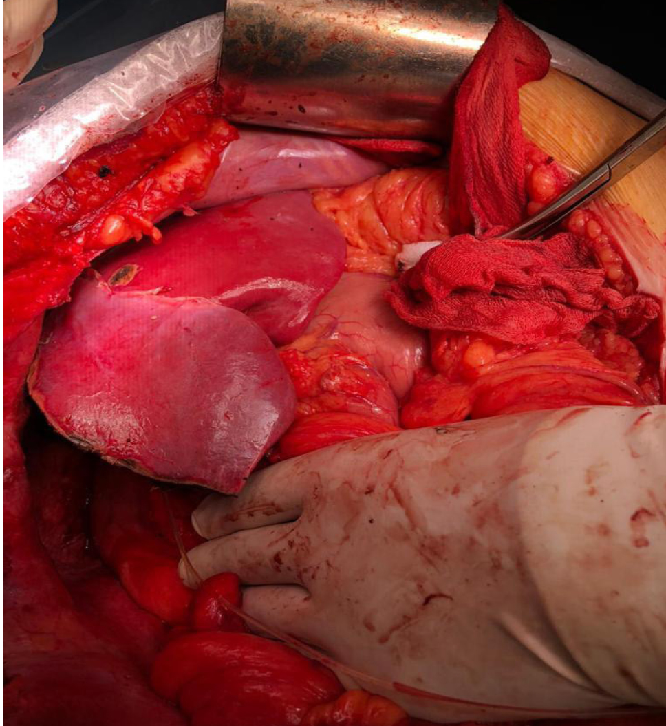 Протокол операции. Под эндотрахеальным наркозом лапаротомия по Кальне. При ревизии левая доля с признаками гипертрофии, достаточных размеров, расценена как достаточная для обеспечения функции после резекции правой доли печени (рис. 3).