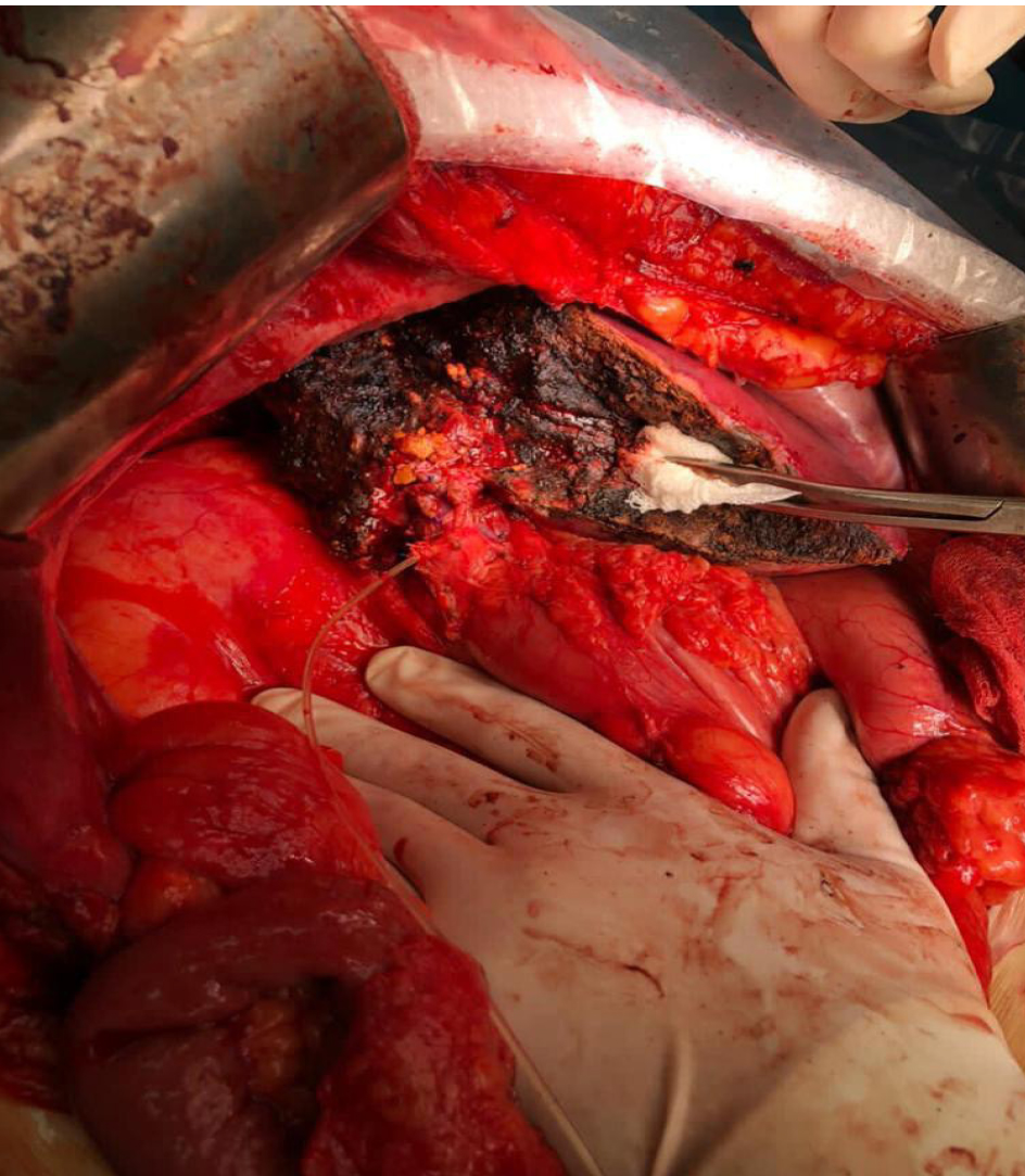 Через 20 дней пациентка госпитализирована в отделение для обследования решения вопроса о проведении второго этапа хирургического лечения. Клинически и по результатам обследования состояние пациентки было удовлетворительное. По данным КТ волюмометрии печени, объем 1, 2, 3, 4-го сегментов печени составлял 450 см³, объем сочтен допустимым, для выполнения правосторонней гемигепатэктомии. Пациентке была выполнена правосторонняя гемигепатэктомия с атипичной резекцией 3-го сегмента печени.