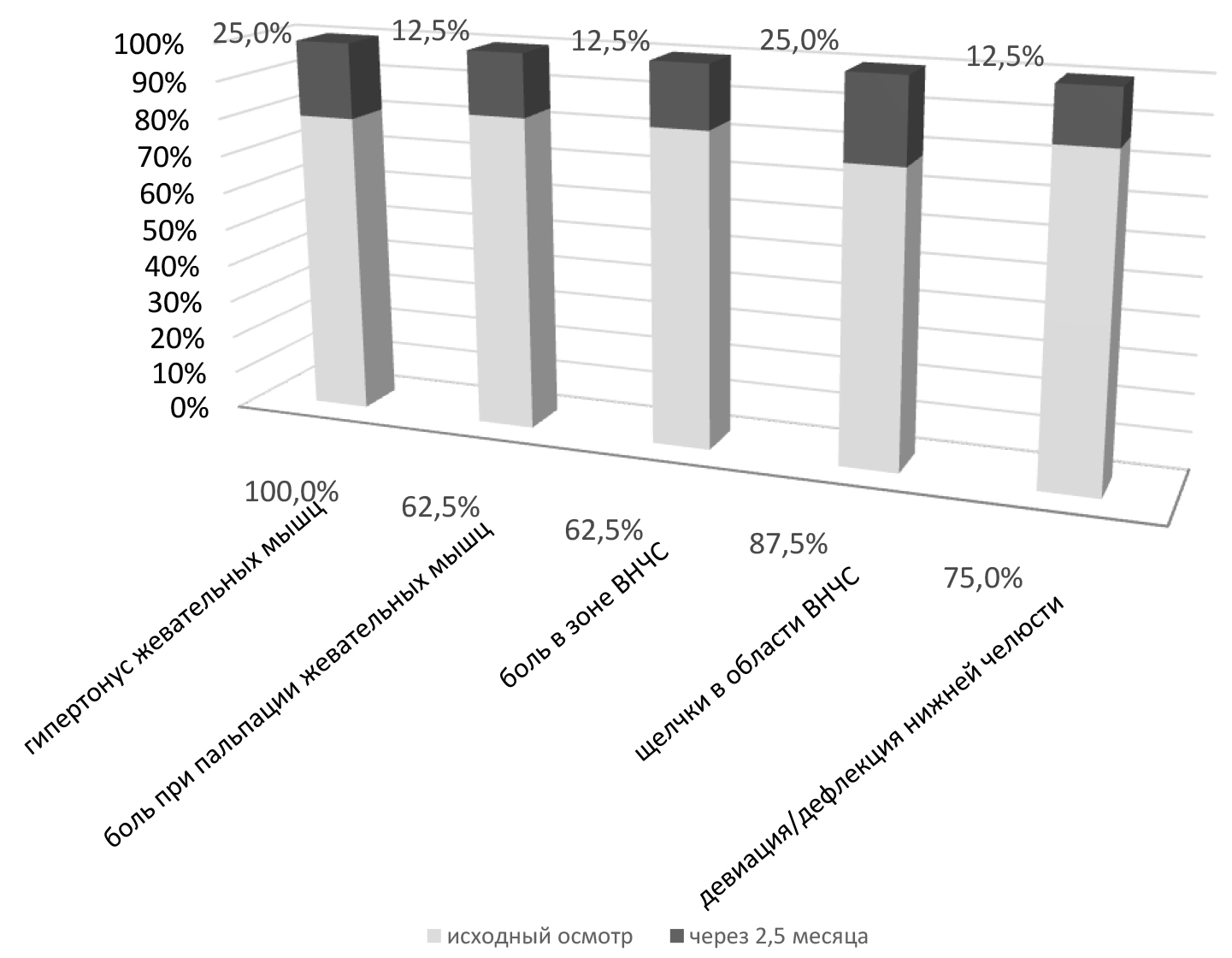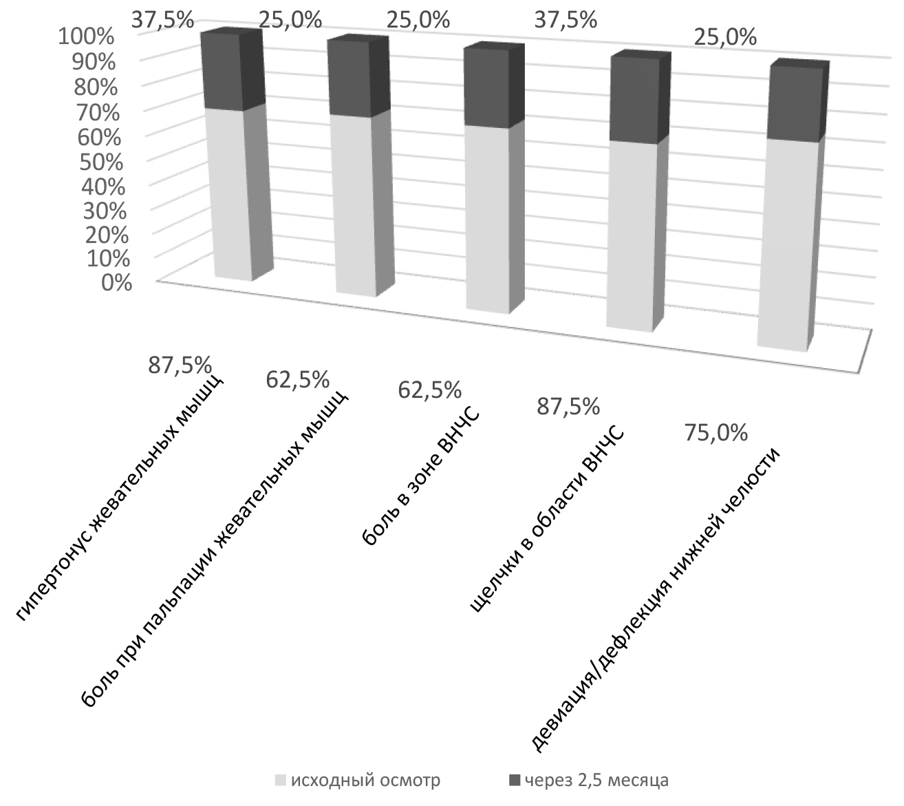 Результаты исходного осмотра в подгруппе А2 (8 человек): гипертонус жевательных мышц был выявлен у 87,5 % исследуемых, боль при пальпации жевательных мышц – у 62,5 % и зоны ВНЧС – у 62,5 %; щелканье в ВНЧС – у 87,5 %, девиация/дефлекция при открывании рта – у 75 % пациентов (рис. 3); в подгруппе Б2 (8 человек) были выявлены следующие признаки: гипертонус жевательных мышц – у 87,5 %, боль при пальпации жевательных мышц – у 50 % и зоны ВНЧС – у 50 % исследуемых (рис. 4). При осмотре через 2,5 месяца в подгруппе А2 (8 человек) было отмечено: гипертонус жевательных мышц наблюдался лишь у 37,5 % пациентов, боль при пальпации жевательных мышц – у 25 %, зоны ВНЧС – у 25 % исследуемых; щелчки в области ВНЧС – у 37,5 % пациентов, девиация/дефлекция выявлялась лишь у 25 % исследуемых в этой подгруппе (рис. 3); в подгруппе Б2 (8 человек): гипертонус жевательных мышц наблюдался у 25 % пациентов, боль при пальпации жевательных мышц отмечалась лишь у 12,5 % и зоны ВНЧС – у 37,5 % исследуемых (рис. 4).