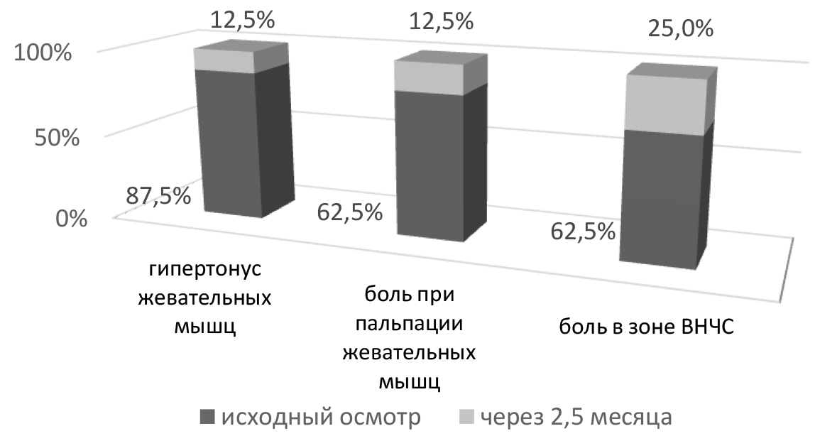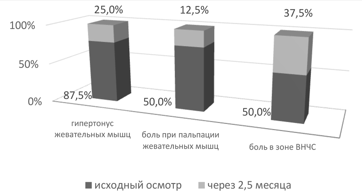 У основной группы пациентов с аномалиями прикуса (32 человека) были выявлены: гипертонус жевательных мышц у 90,6 % исследуемых, боль при пальпации жевательных мышц у 59,4 % и зоны ВНЧС у 59,4 %, щелканье в области ВНЧС у 43,75% исследуемых, девиация/дефлекция при открывании рта у 37,5% пациентов. В подгруппе А1 (8 человек) исходный осмотр показал: гипертонус жевательных мышц выявлен у 100 % исследуемых, боль при пальпации жевательных мышц – у 62,5 % и зоны ВНЧС – у 62,5% пациентов, щелканье в области ВНЧС – у 87,5 % исследуемых, девиация/дефлекция при открывании рта – у 75 % пациентов (рис. 1), а в подгруппе Б1 (8 человек): гипертонус жевательных мышц выявлялся у 87,5% исследуемых, боль при пальпации жевательных мышц – у 62,5 % и зоны ВНЧС – у 62,5 % пациентов (рис. 2). При осмотре через 2,5 месяца в подгруппе А1 (8 человек) отмечено: гипертонус жевательных мышц наблюдался лишь у 25 % пациентов, боль при пальпации жевательных мышц – у 12,5 % и боль в зоне ВНЧС – у 12,5 %, щелчки в области ВНЧС – у 25 %, девиация/дефлекция – у 12,5 % исследуемых в этой подгруппе (рис. 1); в то время как в подгруппе Б1 (8 человек) плановый осмотр через 2,5 месяца показал следующие результаты: гипертонус жевательных мышц выявлялся у 12,5 % исследуемых, боль при пальпации жевательных мышц – у 12,5 %; боли при пальпации зоны ВНЧС наблюдались у 25 % пациентов (рис. 2).