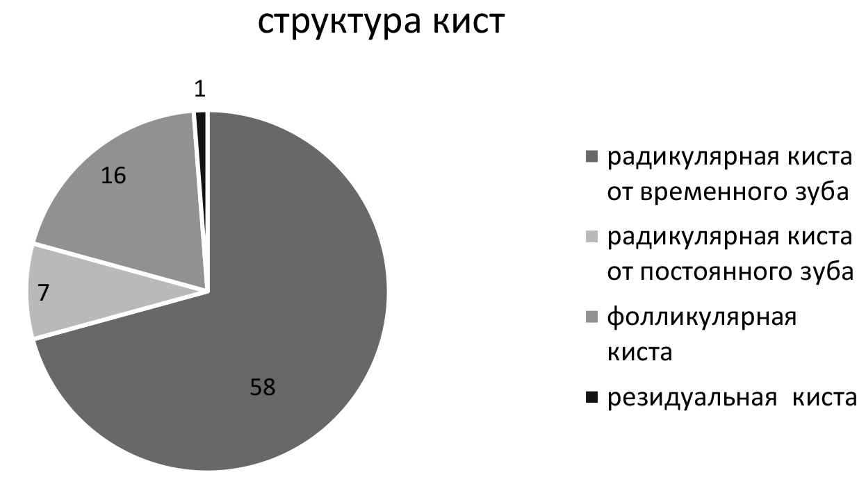 В структуре одонтогенных кист у детей, находившихся на амбулаторном лечении стоматолога-хирурга, преобладали радикулярные кисты, ассоциированные с временными зубами, и фолликулярные кисты. С учетом сложности дифференциальной диагностики при патогистологическом исследовании операционного материала радикулярной кисты от временного зуба и фолликулярной кисты необходима корреляция клинико-рентгенологических и патогистологических признаков. Результаты данного исследования подчеркивают значимость патогистологического исследования операционного материала, особенно в аспекте онкологической настороженности.