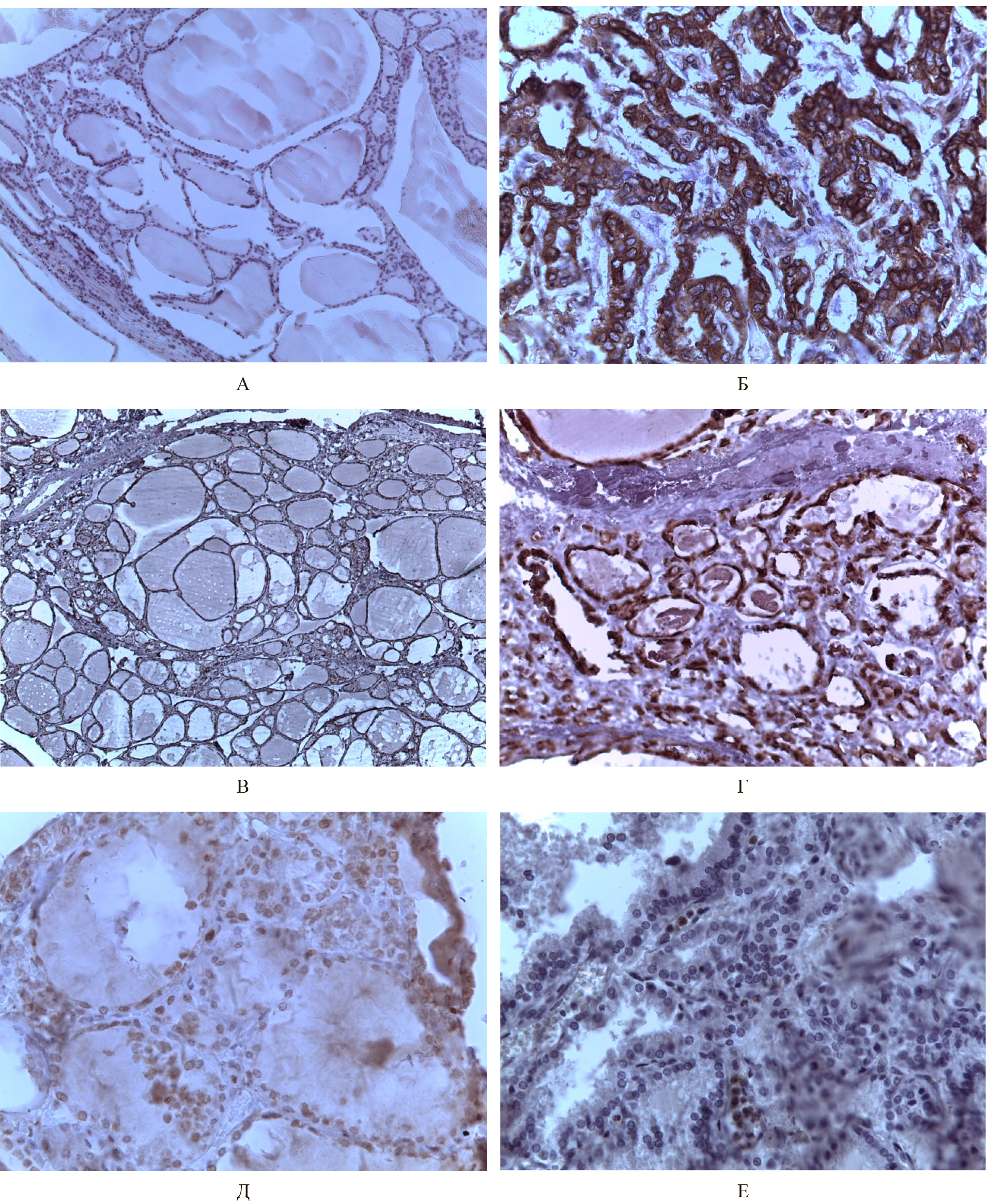 Рис. Узловые образования щитовидной железы: А – иммунонегативное окрашивание узловых образований ЩЖ к CK18. Ув. ×100; Б – обилие иммунопозитивных тироцитов к CK18 при фолликулярном раке ЩЖ. Ув. ×200; В – иммунонегативное окрашивание узловых образований ЩЖ к CK8. Ув. ×400; Г – обилие иммунопозитивных клеток к CK8 в узловом образовании ЩЖ. Ув. ×200; Д – единичные иммунопозитивные клетки к Oct3/4 (стрелка). Ув. ×400; Е – островки иммунопозитивных клеток к PHH3. Ув. ×400