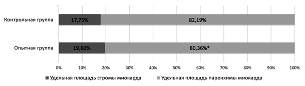 Прежде всего, нами установлено, что опытная группа статистически значимо отличалась от группы контроля (р = 0,008) по количеству сократительных кардиомиоцитов в единице условной площади стенки левого желудочка. Так, если у интактных животных количество сократительных кардиомиоцитов составляет 53,6 (49,2; 57,2), то у опытных крысят данный показатель снижен до величины 48,6 (46,2; 52,3). Стоит отметить, что данный показатель коррелирует со значениями, полученными при подсчете удельной площади соединительной ткани и сердечной мышечной ткани в миокарде левого желудочка (рис.). На графике видно, что удельная площадь паренхимы миокарда у опытных животных на 1,83 % ниже таковой у интактной группы животных.