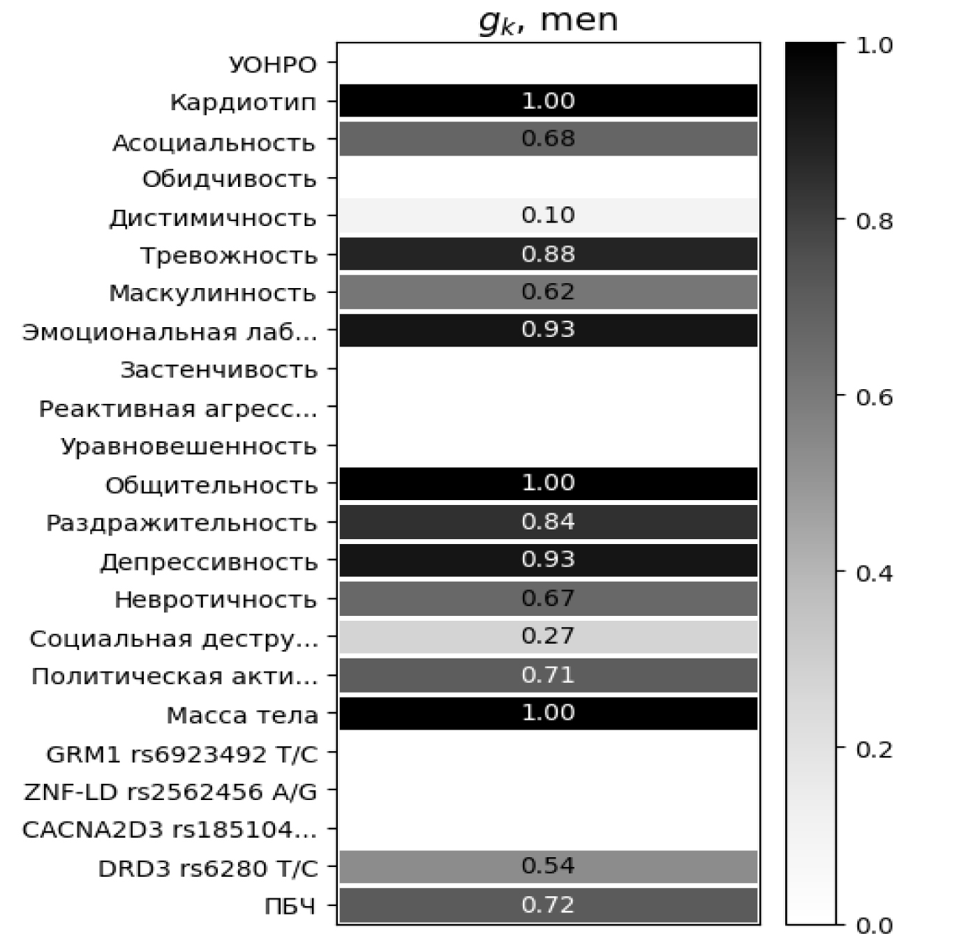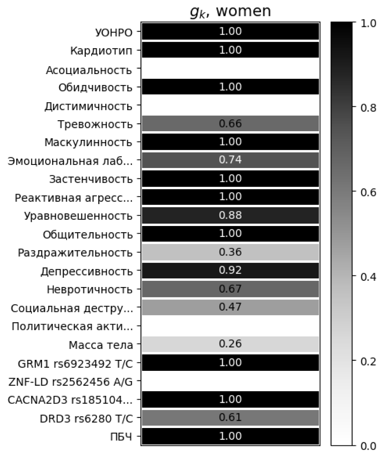 У женщин мажорный генотип G/G rs1851048 (CACNA2D3) статистически значимо связан с депрессивностью, невротичностью и эмоциональной лабильностью, что в данной совокупности подтверждает его возможную роль в провокации рискованного поведения. У мужчин связь rs1851048 (CACNA2D3) с раздражительностью также может интерпретироваться как элемент склонности к поведению риска. SNP rs2562456 (ZNF) (минорный генотип G/G) у женщин статистически значимо связан с массой тела и ПБЧ, что препятствует формированию поведения риска. У мужчин мажорный генотип A/A rs2562456 (ZNF) связан с маскулинностью и уравновешенностью. Данная комбинация показателей психологического статуса у мужчин свидетельствует об отсутствии склонности к рискованному, в частности аутоагрессивному поведению.