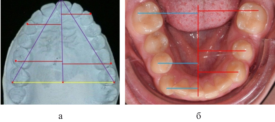 Биометрию гипсовых моделей при асимметричной форме дуги проводили на масштабированных (1 : 1) фотографиях с нанесением на них основных ориентиров. Основной линией была трансверсаль постериальной части дуги, которая соединяла дистальные ориентиры вторых моляров. От середины постериальной трансверсали строили перпендикуляр в переднем направлении. Размер передне-задней диагонали, которая ограничивала центральную (в норме – межрезцовую) точку дуги с дистальным ориентиром второго моляра, рассчитывали как произведение суммарной величины ширины коронок 7 зубов к дентально-диагональному коэффициенту. Указанный коэффициент для верхней челюсти составлял 1,06, для нижней арки – 1,09. Полученную величину откладывали с двух сторон от дистального ориентира, до пересечения с условной срединной сагиттальной линией в переднем отделе. Таким образом, получали прогнозируемое расположение центральной точки, которая соответствовала оптимальному положению медиальных контактных пунктов центральных резцов. Измеряли расстояние от конструируемой точки до фактической в разных направлениях.