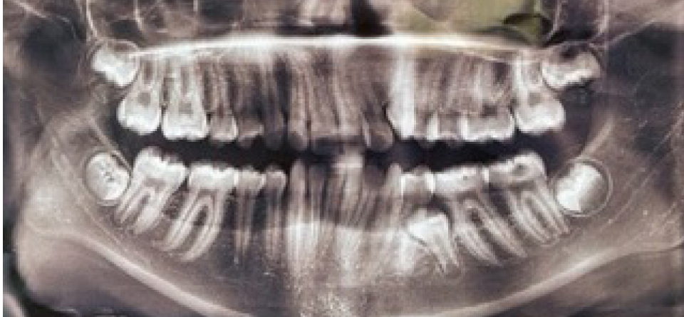 Рис. 2. Ортопантомограмма у пациентки с ретенцией второго нижнего премоляра слева
