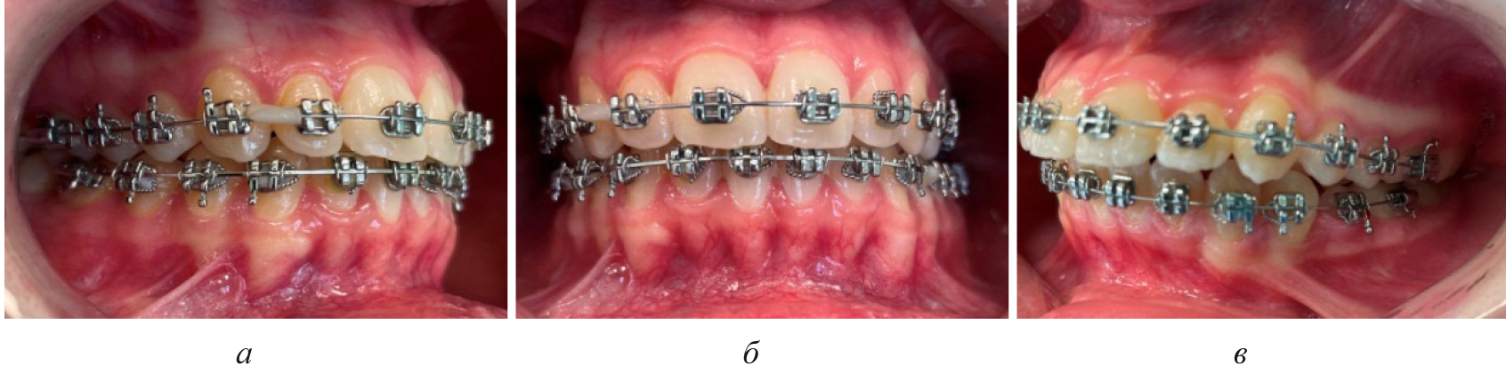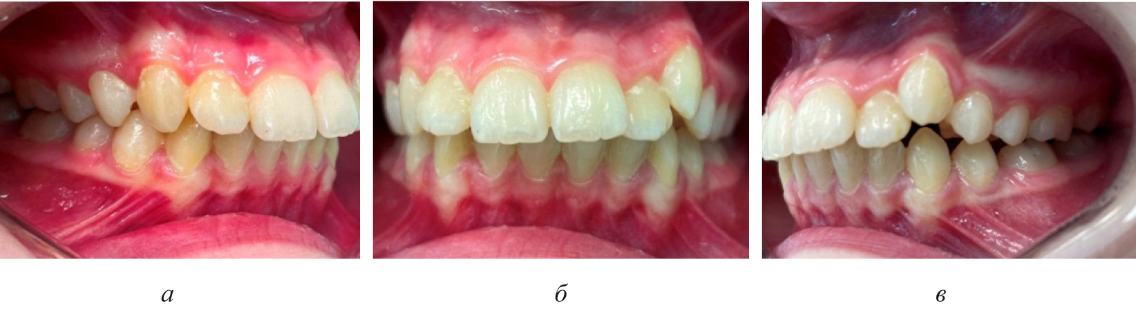 Рис. 5. Окклюзионные взаимоотношения справа (а), спереди (б) и слева (в) на завершающем этапе лечения