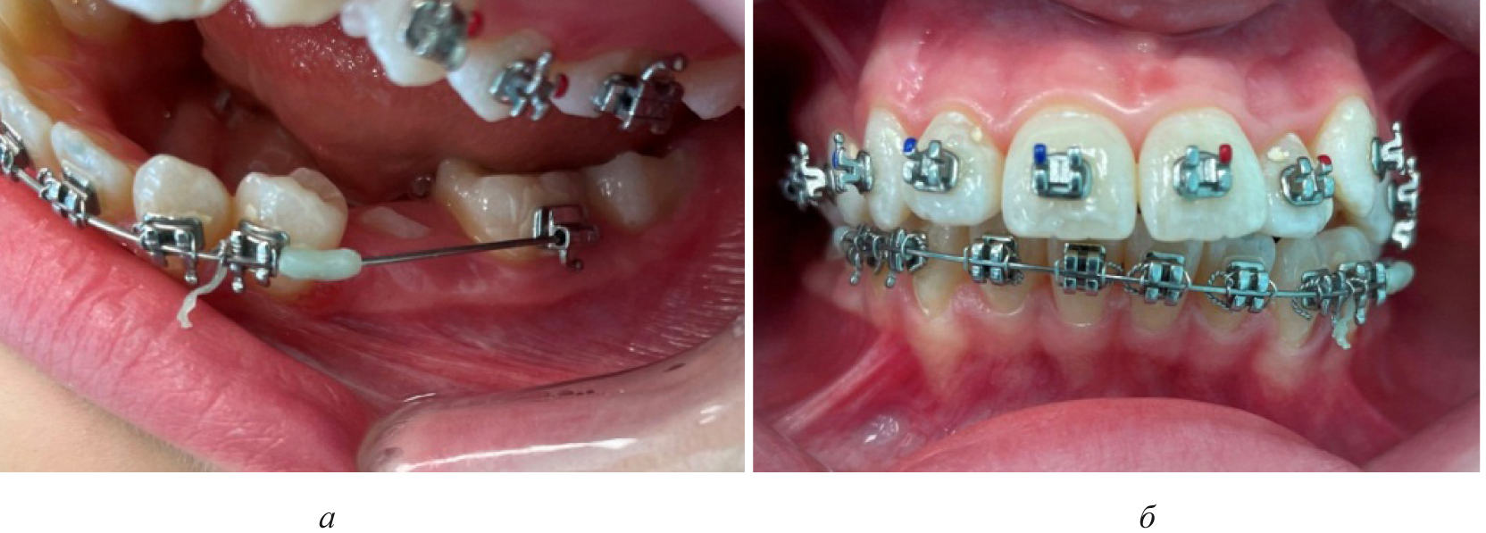 Рис. 4. Создано место для прорезывания премоляра (а), установлена аппаратура на верхнюю челюсть (б)