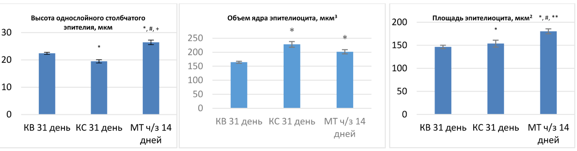 На фоне моделированного ускоренного старения выявлено утолщение эндометрия матки крыс на 12,5 % (p < 0,05). Морфологическое исследование однослойного столбчатого эпителия эндометрия матки крыс, подвергшихся 30-суточной темновой депривации, на 31-е сутки показало уменьшение высоты однослойного столбчатого эпителия на 15,1 % (p < 0,05), однако средняя площадь эпителиоцита увеличилась на 5 % (p < 0,05). Также отмечалось увеличение объема ядра эпителиоцита на 38,7 % (p < 0,01) и ядерно-цитоплазматического индекса на 25 % (рис. 1).