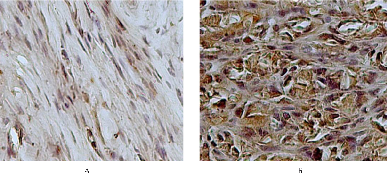 Рис. 3. Гистологическое строение сухожилия крысы из группы 1: А – иммуногистохимическое исследование антитела против MMP1, докраска гематоксилином Карацци (ув. × 400), Б – иммуногистохимическое исследование антитела против MMP9, докраска гематоксилином (ув. × 400)