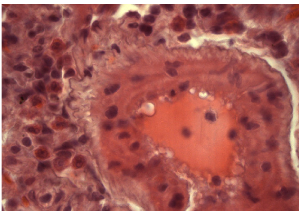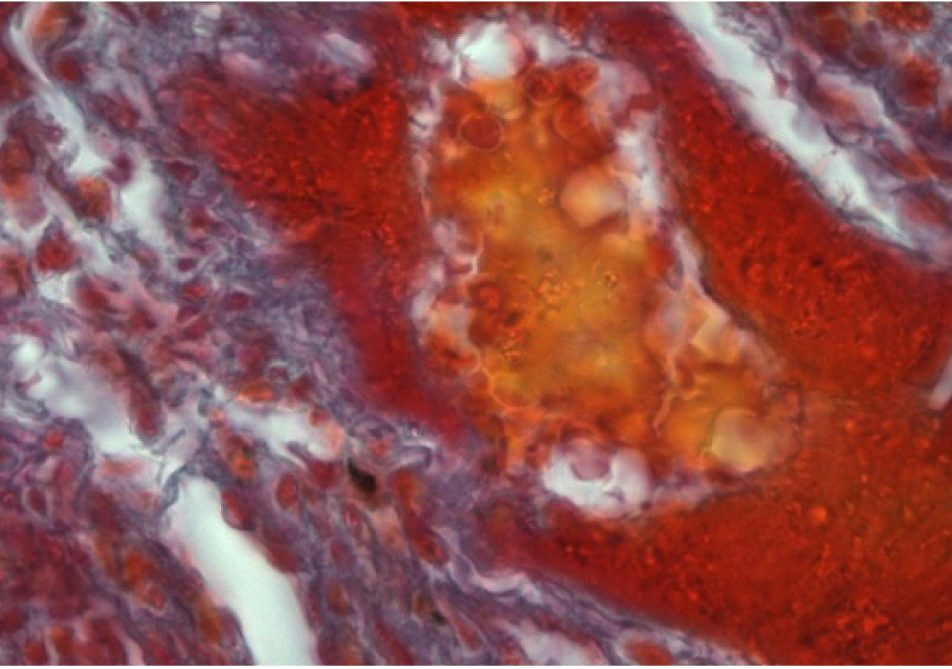 Рис. 11. Группа 8. Гемолиз эритроцитов в просвете артерии. Периваскулярный инфильтрат, содержащий эозинофилы. Окраска гематоксилином и эозином. Ок. 10. Об. 100. Иммерсия