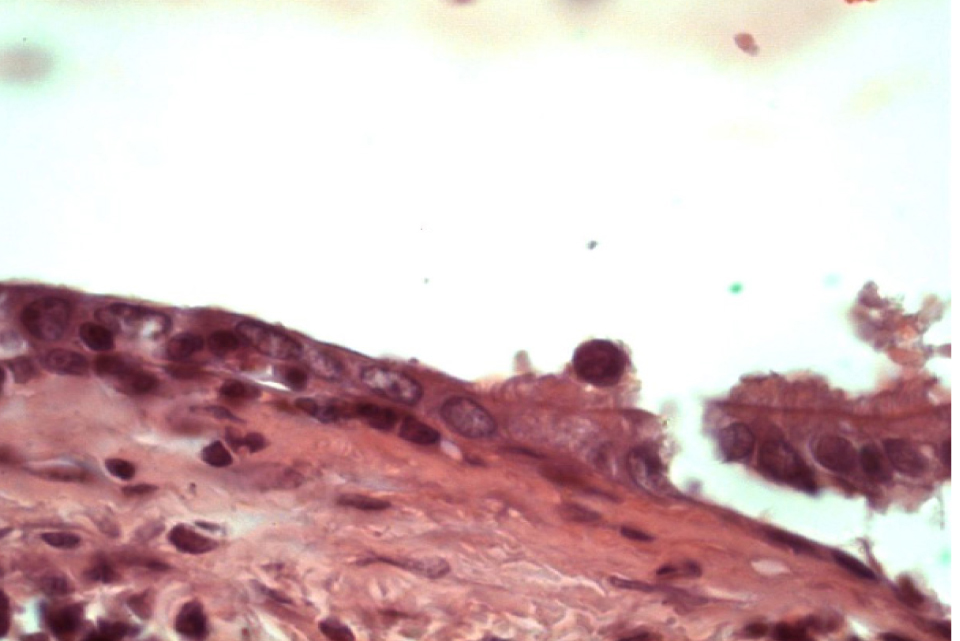 Рис. 8. Образование однослойного плоского эпителия, замещающего участки повреждения. Окраска гематоксилином и эозином. Ок. 10. Об. 100. Иммерсия