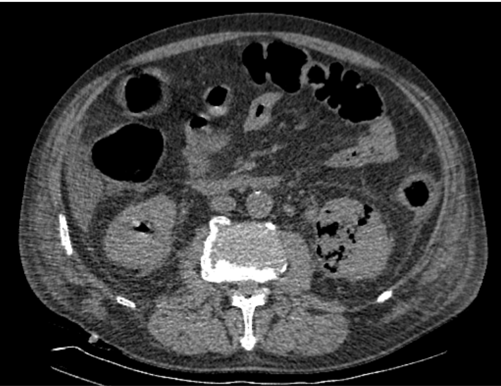 Рис. 1. Компьютерная томография органов брюшной полости, забрюшинного пространства, органов малого таза. Газ в мочевом пузыре