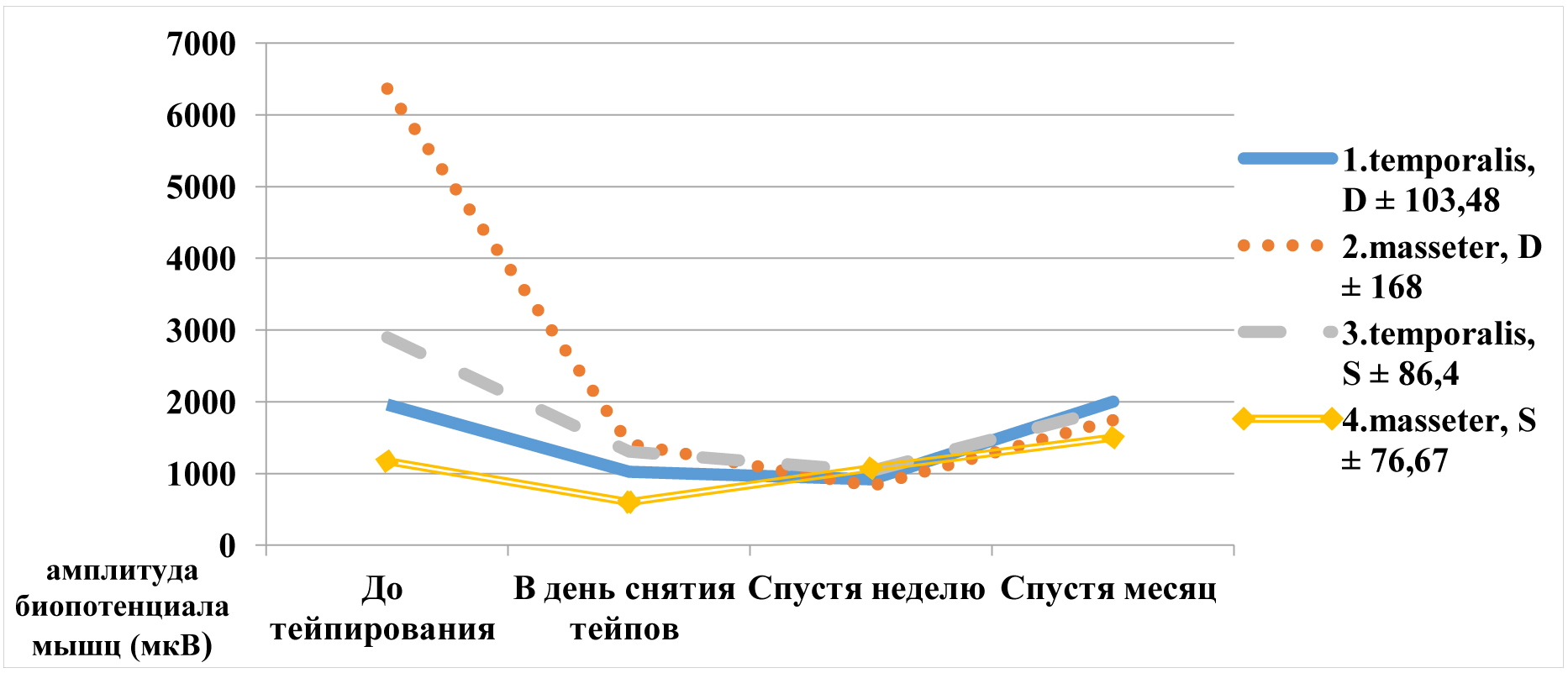 В результате проведения поверхностной ЭМГ напряжения были получены следующие данные: до проведения кинезиотейпирования пациенты имели при сжатии зубов слева среднюю амплитуду биопотенциалов: височной мышцы справа – (1288,48 ± 147,36) мкВ, жевательной мышцы справа –(409,5 ± 46,34) мкВ, височной мышцы слева – (984 ± 28) мкВ, жевательной мышцы слева – (658,54 ± 138,17) мкВ. При сжатии зубов справа имели среднюю амплитуду биопотенциалов: височной мышцы справа – (264,7 ± 28,4) мкВ, жевательной мышцы справа – (532,76 ± 64,83) мкВ, височной мышцы слева – (944,74 ± 129,3) мкВ, жевательной мышцы слева – (411,5 ± 39,4) мкВ. В день снятия тейпов (после кинезиотейпирования) пациенты имели при сжатии зубов слева среднюю амплитуду биопотенциалов: височной мышцы справа – (706,26 ± 147,36) мкВ, жевательной мышцы справа – (204,8 ± 46,34) мкВ, височной мышцы слева – (306,02 ± 28) мкВ, жевательной мышцы слева – (306,59 ± 138,17) мкВ. При сжатии зубов справа имели среднюю амплитуду биопотенциалов: височной мышцы справа – (103,4 ± 28,4) мкВ, жевательной мышцы справа – (298,44 ± 64,83) мкВ, височной мышцы слева – (486,79 ± 129,3) мкВ, жевательной мышцы слева – (289,3 ± 39,4) мкВ.