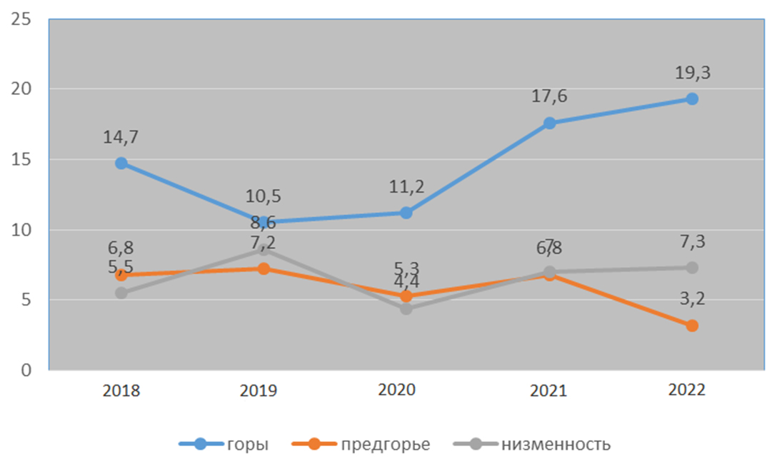 По данным на 2018 г. в предгорной местности показатель составлял 0,41 на 1 000 населения, а в 2022 г. он увеличился до 2,1 (увеличение в 5,1 раза). Почти такая же картина наблюдалась в равнинной климатической зоне. В 2018 г. показатель был равен 0,69, а в 2022 г. – 2,2 (увеличился в 3,2 раза).
