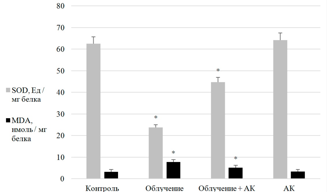 Предлучевое введение аскорбиновой кислоты способствует снижению генерации токсичных свободных радикалов (относительно низкие уровни MDA) и предотвращает развитие оксидативного стресса, поддерживая состоятельность антиоксидантной системы (уровень SOD практически приближался к контрольным значениям). Это привело к уменьшению степени постлучевого повреждения печени и замедлению гибели гепатоцитов, что подтверждено результатами морфологического, морфометрического и биохимического исследований, позволяя говорить о возможном протективном действии аскорбиновой кислоты.