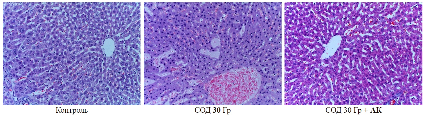 По результатам морфофункционального исследования печени выявили, что локальное облучение электронами в СОД 30 Гр через неделю приводит к нарушению гистоархитектоники с развитием лучевого гепатита. Введение аскорбиновой кислоты снижает глубину и диапазон радиационно-индуцированного повреждения, усиливает эффективность антиоксидантной защиты.