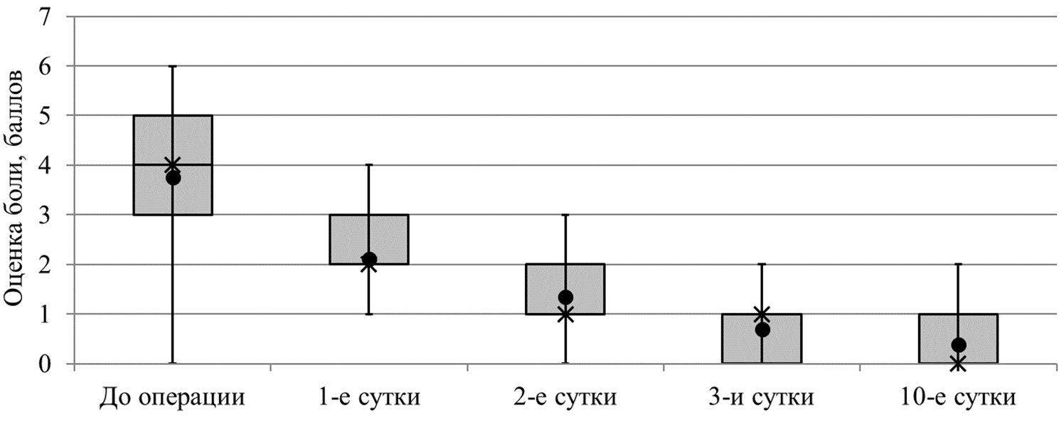 Для установления статистически значимых различий оценок боли по ВАШ применялся ранговый (непараметрический) критерий Фридмана. Согласно проведенному анализу, степень выраженности болей значительно уменьшается по мере увеличения времени после операции и к десятым суткам пациентки активных жалоб не предъявляли (рис. 2). Средние значения оценок по ВАШ, соответствующие разным моментам наблюдения, приведены в табл. 5.