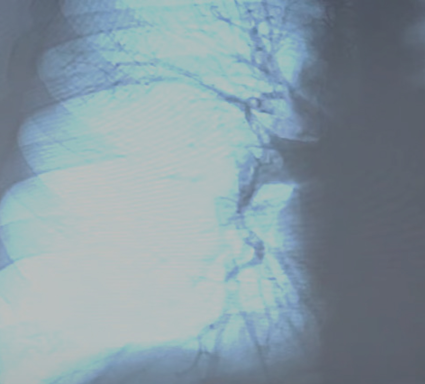 Рис. 2. Ангиопульмонография, картина среднедолевой эмболии в системе правой легочной артерии