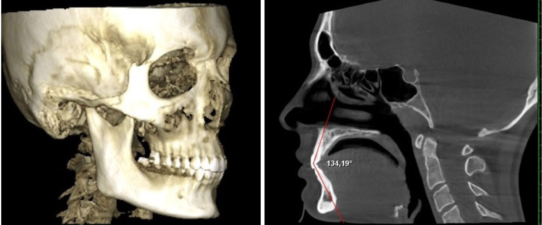 Рис. 1. Объемный снимок головы и определение межрезцового угла в сагиттальной проекции