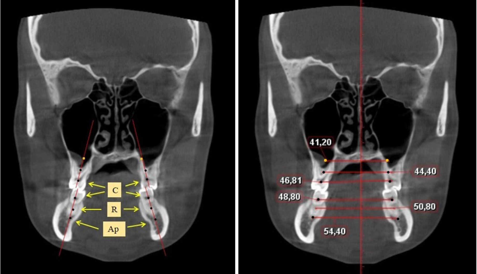 Определение ширины задних отделов зубочелюстных дуг проводили на срезах КЛКТ через дистальные поверхности вторых моляров. Проводили условные срединные вертикали вторых моляров, на которых устанавливали точки на уровне шеек зубов («С»), на уровне середины корня («R») и на уровне апикальной части корня («Ар»), как на верхней, так и нижней челюсти (рис. 2).
