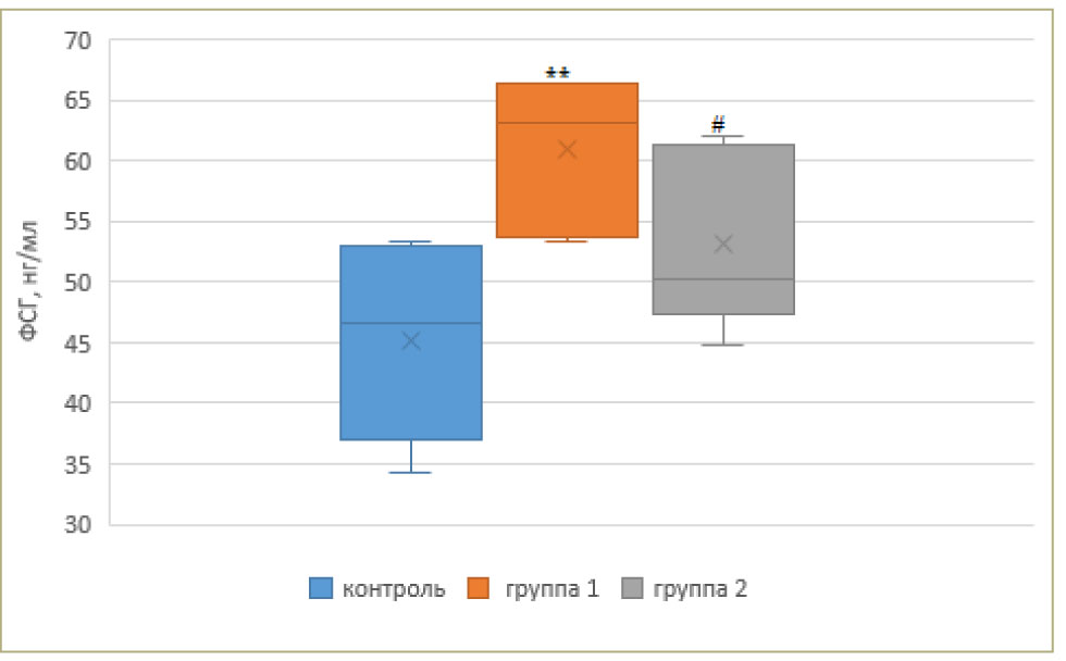 На 31-е и 45-е сут. у экспериментальных животных после проведения внутрибрюшинной анестезии с использованием хлоралгидрата в дозе 400 мг/кг осуществляли забор крови из брюшной аорты. Кровь помещали в пробирки, содержащие 3,8%-й водный раствор цитрата натрия в объеме 5 мл (НЦИЛС ВолгГМУ, Россия). Затем, применяя метод твердофазного иммуноферментного анализа на автоматическом микропланшетном фотометре Sunrise TS4TECAN (Tecan Austria GmbH, Австрия), проводился анализ уровня фолликулостимулирующего гормона (ФСГ) в сыворотке крови с помощью наборов ELISA Kit (Cloud-Clone Corp., США), согласно рекомендациям производителя. Животных выводили из эксперимента в ходе декапитации с использованием гильотины (ООО «Открытая наука», Россия) согласно руководству по эвтаназии животных (National Research Council Committee for the Update of the Guide for the Care and Use of Laboratory, 2011).