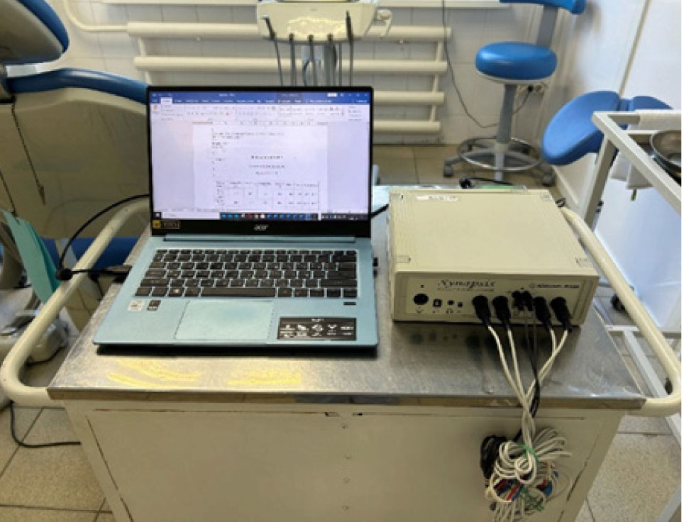 В обследовании приняло участие 34 человека с диагнозом: Потеря зубов вследствие несчастного случая, удаления или локальной периодонтальной болезни – К08.1. средней возрастной группы 45–59 лет (группа сравнения). Для получения нормированных параметров электромиографических данных была сформирована группа контроля аналогичного возраста. Средний возраст обследуемых составил (52,3 ± 2,4) года. Обследование выполнено согласно правилам Регионального локального этического комитета ФГБОУ ВО ВолгГМУ (протокол № 2021/14 от 19.11.2021 г.). Для анализа состояния жевательной мускулатуры использовали 4-канальный электромиограф Synapsis (Россия), позволяющий оценить реципрокную регуляцию и функциональные взаимоотношения симметричных антагонистов, агонистов и синергистов в процессе жевания и движений нижней челюсти (рис. 1).