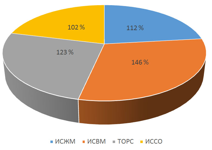 Так, у пациентов с полной вторичной адентией отмечается преобладание работы жевательных и височных мышц с левой стороны – ИСВМ составил (146,3 ± 14,5) %, ИСЖМ – (112,8 ± 13,1) %. ТОРС – (123,4 ± 16,3) %, что свидетельствовало о перекрестном доминировании височной мышцы справа и жевательной слева над височной мышцей слева и жевательной справа, ИССО – (102,6 ± 8,7) % – повышенная активность работы височных мышц над жевательными.
