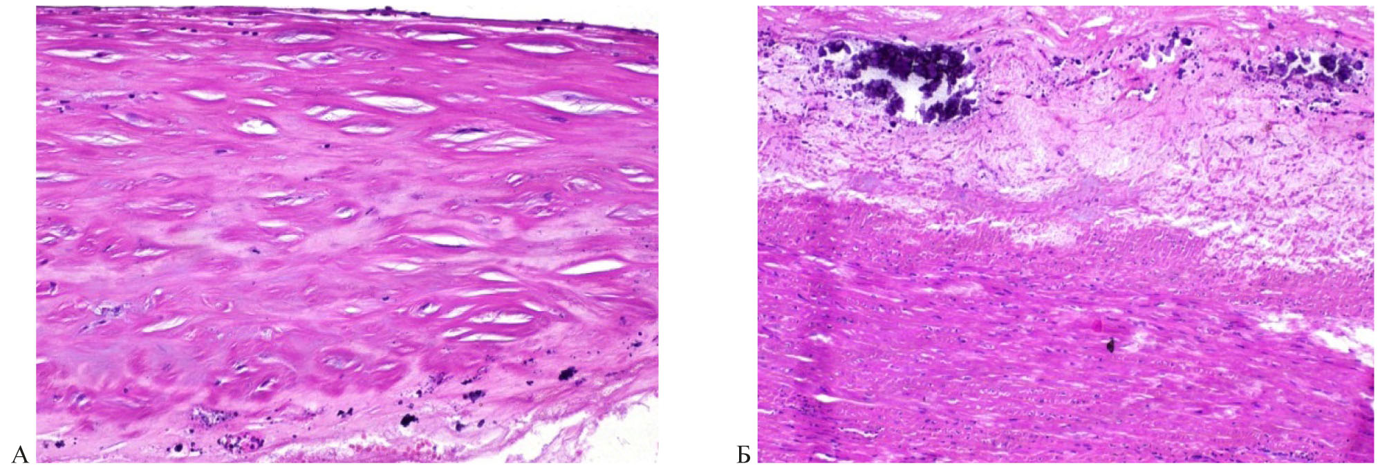 Рис. 4. Микрофотография среза стенки кровеносного сосуда. Область атеросклеротической бляшки. Ув. ×400 (А), ×200 (Б)