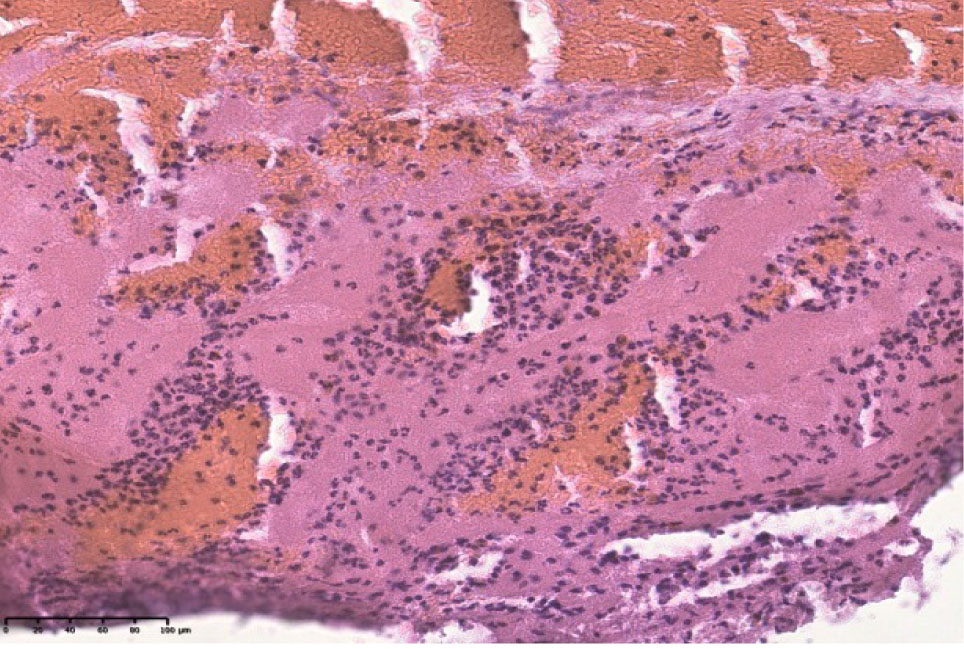Рис. 1. Срез стенки сердца мужчины 67 лет (инфаркт миокарда) (А). Срез стенки сердца женщины 65 лет (повторный инфаркт миокарда) (Б). Окрашено гематоксилином и эозином.