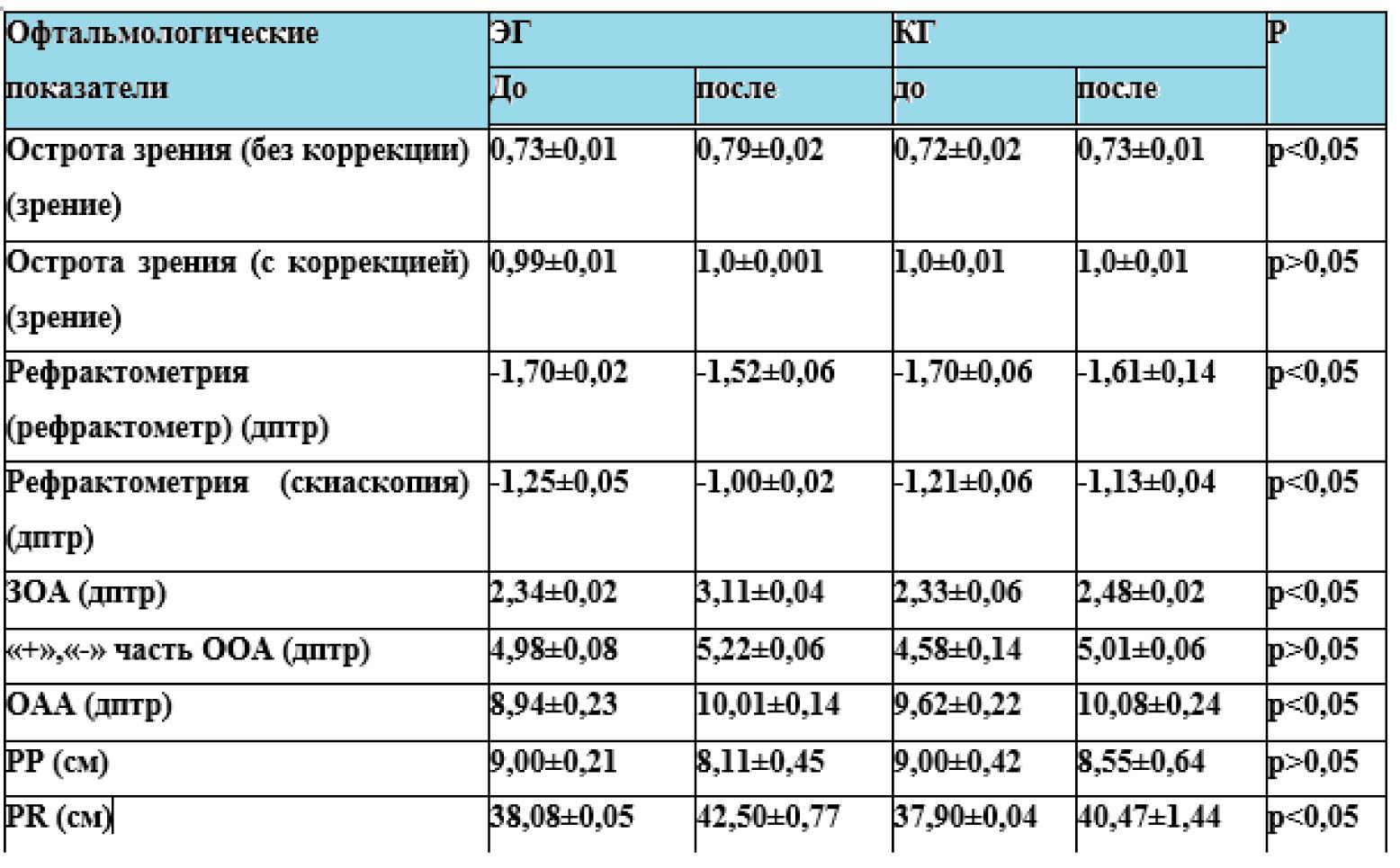 Клинические результаты изменения основных офтальмологических показателей после применения авторской программы коррекционно-оздоровительных занятий у юных спортсменов с миопией слабой степени и спазмом аккомодации