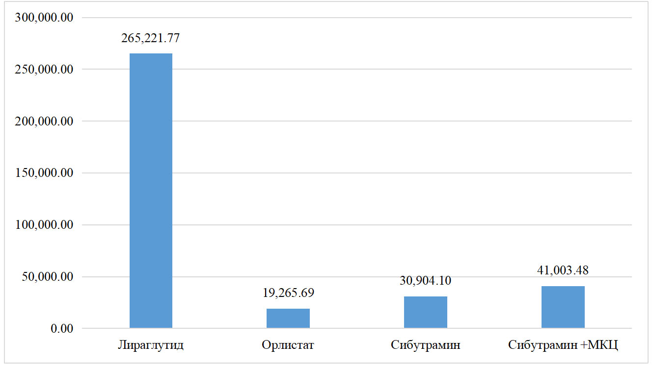 При этом средняя стоимость лекарственной терапии рассчитывалась с учетом эпидемиологических данных о распределении приема препаратов, средних дозах и МНН в реальной клинической практике. Средняя стоимость 1 ЕД ЛП равнялась стоимости 1 упаковки, деленной на количество ЕД в упаковке. Средняя стоимость годового курса лечения 1 пациента при назначении ЛП (руб. в год) равнялась произведению рассчитанной средневзвешенной стоимости 1 ЕД ЛС и средней назначенной суточной дозы (PDD), выраженной в ЕД/сут., умноженной на 365 дней. В итоге были рассчитаны средняя годовая стоимость лекарственной терапии 1 больного ожирением.