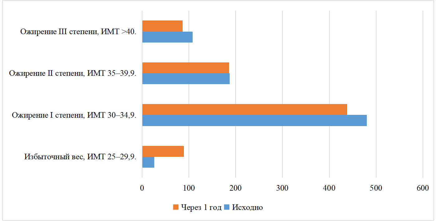 При анализе распределения пациентов по ИМТ показано, что большая часть пациентов на старте наблюдения и через 1 год имела ожирение I степени (рис. 2).