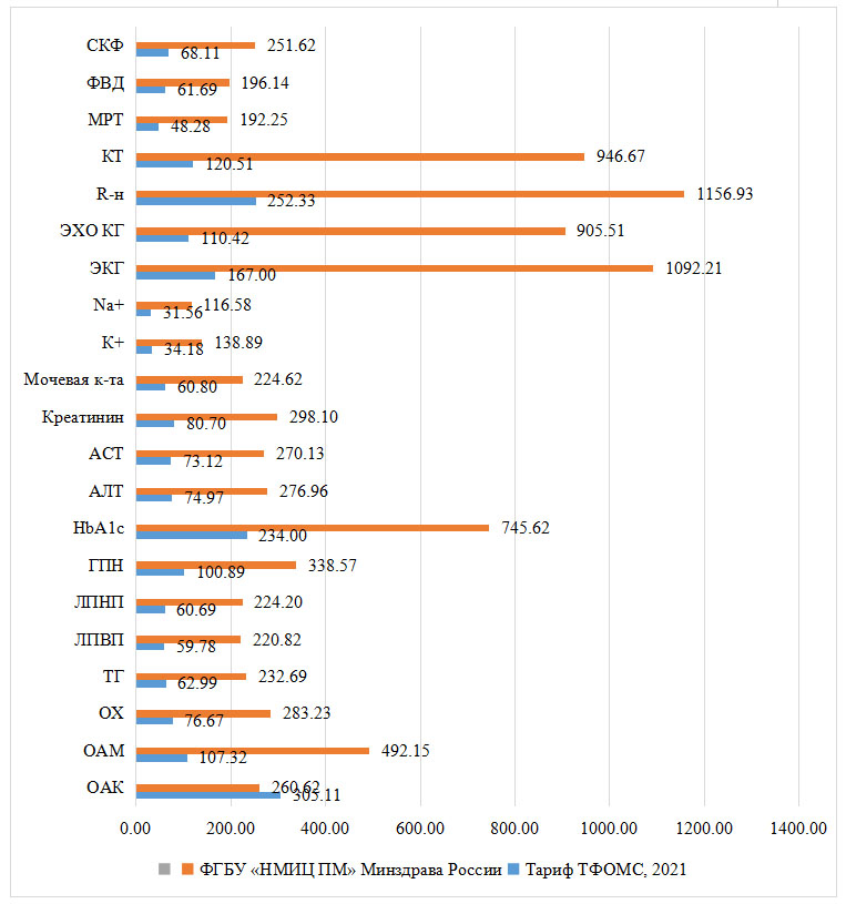 Общая стоимость диагностических обследований на 1 пациента в год с учетом частоты предоставления составила 2 170,73 руб. по тарифам ТФОМС, 2021 г. и 8 748,40 р. по тарифам ФГБУ «НМИЦ ПМ» Минздрава России, что иллюстрирует разницу при оценке бремени ожирения с позиций государства и пациента.