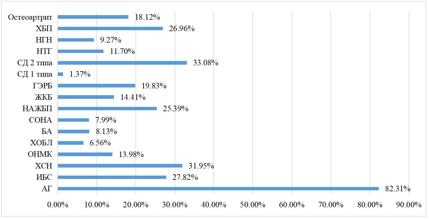 Рис. 4. Структура коморбидной патологии: АГ – артериальная гипертензия; БА – бронхиальная астма; ГЭРБ – гастроэзофагеальная рефлюксная болезнь; ЖКБ – желчнокаменная болезнь; ИБС – ишемическая болезнь сердца; НАЖБП – неалкогольная жировая болезнь печени; НГН – нарушенная гликемия натощак; НТГ – нарушенная толерантность к глюкозе; ОНМК – острое нарушение мозгового кровообращения; СД – сахарный диабет; СОНА – синдром обструктивного апноэ сна; ХБП – хроническая болезнь почек; ХОБЛ – хроническая обструктивная болезнь легких; ХСН – хроническая сердечная недостаточность