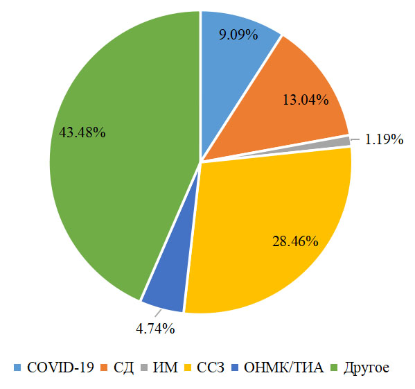 При анализе числа госпитализаций показано, что среднее число госпитализаций на одного пациента составило 0,23 госпитализаций в год, из них большая часть приходилась на госпитализации по поводу ССЗ и СД2.