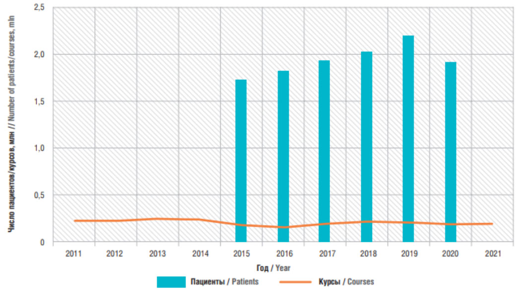 Рис. 10. Соотношение числа зарегистрированных в РФ пациентов с диагнозом «ожирение» к суммарному количеству годовых курсов сибутрамина, орлистата и лираглутида в 2011–2021 гг. [10]