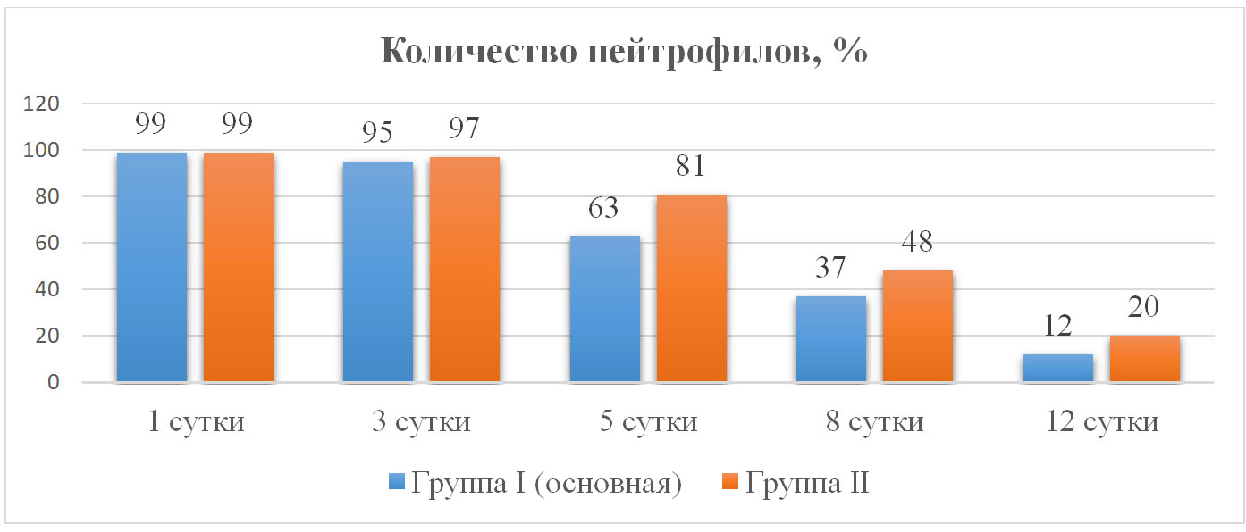 Анализ цитограмм, полученных в первые сутки после оперативного лечения у всех пациентов, свидетельствовал об активном воспалительном процессе в ране, а также большом количестве нейтрофилов при наличии единичных фибробластов. Динамика изменения количества нейтрофилов в различные сроки в группах сравнения представлена на рис. 1. Достоверно значимых отличий в этот период не зафиксировано.