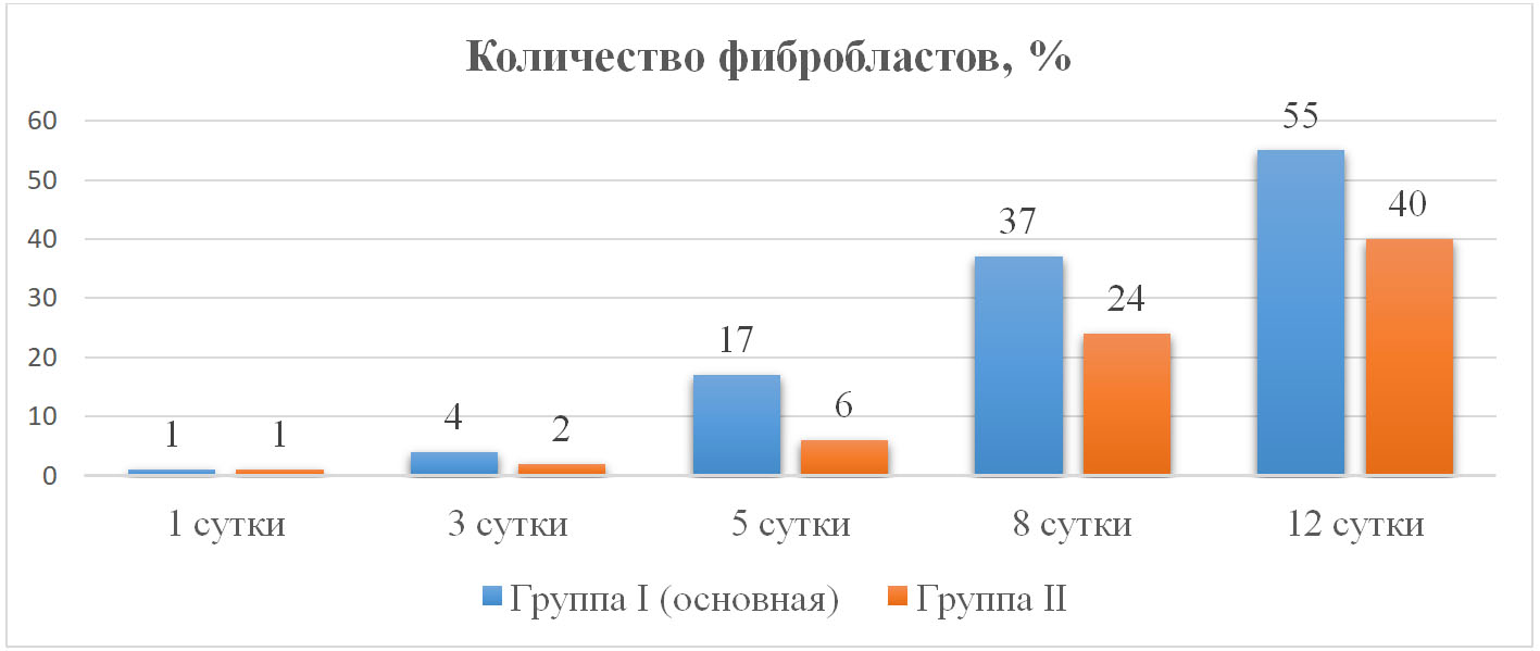 На 5-е сутки в I группе наблюдали очищение ран и появление небольшого количества грануляций у 20 пациентов (83,3 %), во II группе подобная картина наблюдалась только у 2 (7 %) больных с поверхностной локализацией процесса. В цитограммах больных основной группы по сравнению с 3-ми сутками отмечено статистических значимое снижение уровня нейтрофилов и рост числа фибробластов, что свидетельствует о переходе во II фазу раневого процесса. В последующих наблюдениях отличия между группами не только сохранялись, но и возрастали, достигая уровня статистической достоверности. Динамика изменения количества фибробластов в различные сроки в группах сравнения представлена на рис. 2. Применение предложенного алгоритма лечения, согласно данным, полученным при анализе цитологического состава, свидетельствует о более раннем очищении операционных ран и формировании грануляционной ткани.