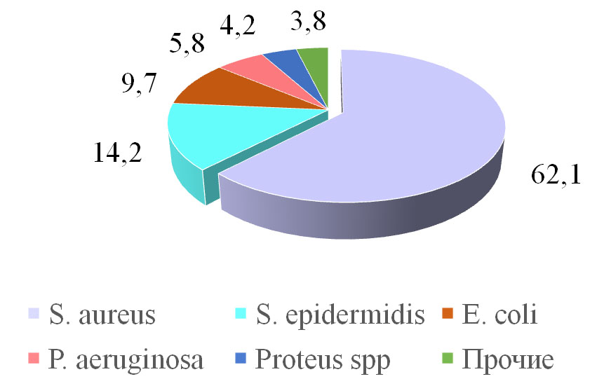 Полученные нами данные свидетельствуют о преобладании в этиологии остеомиелита стафилококков и хронизации процесса за счет грамотрицательных бактерий с высоким уровнем резистентности.