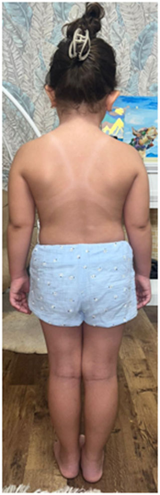 Согласно данным выписки из ФГБУЗ «НМИЦ им. В.А. Алмазова» Минздрава России, во время пребывания состояние удовлетворительное. Рост 117 см, масса тела 27 кг, ИМТ 19,7 (+1,57), (задержка роста более –2SDS), площадь поверхности тела 0,94. Физическое развитие ниже среднего по росту, дисгармоничное за счет легкого избытка веса. Физикальные данные без особенностей. Отмечается короткая шея, брахидактилия (рис.). Наружные половые органы сформированы правильно по женскому типу. Половое развитие по Таннер 1-й степени. Железистая ткань молочных желез не пальпируется.