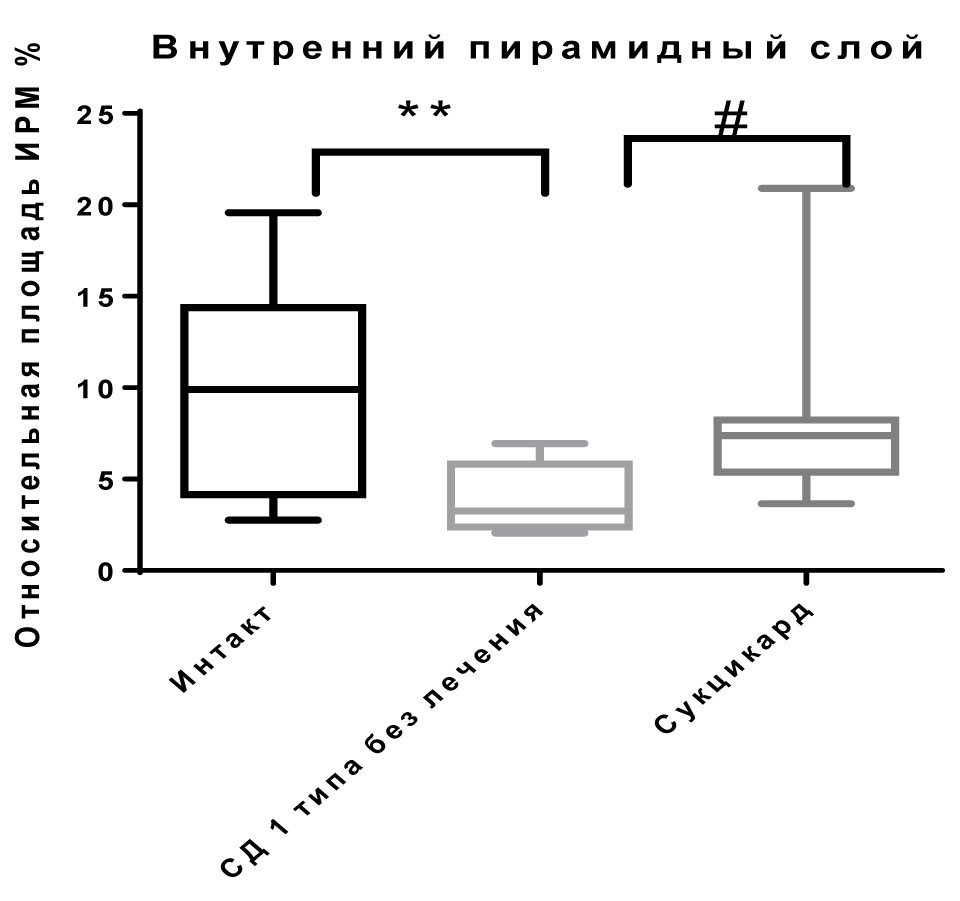 У интактных крыс во внутреннем пирамидном слое относительная площадь ИРМ составила 9,9 % (4,15–14,4), в группе СД1 – 3,26 % (2,39–5,82), что продемонстрировало достоверное снижение относительной площади ИРМ на 6,64 % в группе СД1 (p < 0,01). В группе сукцикарда относительная площадь ИРМ Nf-kВ составила 7,38 % (5,37–8,23), что достоверно выше значений площади ИРМ Nf-kВ в группе СД1 на 4,12 % (p < 0,05) (рис.).