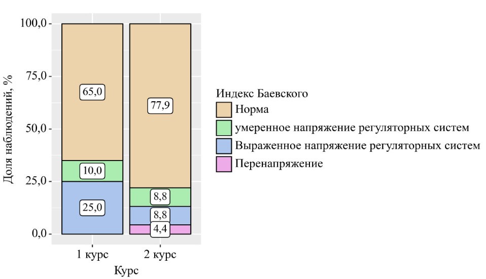 Изучение индекса Баевского в контексте оценки стрессоустойчивости и адаптационных возможностей студентов первого и второго курсов медицинских вузов обусловлено многими факторами. На начальном этапе обучения студенты сталкиваются с высокими учебными нагрузками и стрессовыми ситуациями, связанными с необходимостью адаптации к новому образовательному процессу и социальному окружению. Указанные факторы могут провоцировать рост уровня стресса и снижение учебной мотивации, что негативно сказывается на процессе обучения и может привести к различным нарушениям в состоянии здоровья [2]. Применение индекса Баевского для объективной оценки уровня стресса и адаптационных возможностей обучающихся предоставляет важные данные о функциональном состоянии их вегетативной нервной системы и ее способности к адаптации в условиях повышенных нагрузок. Более того, это исследование может помочь в разработке эффективных стратегий для оптимизации процессов адаптации студентов к образовательному контексту, снижения уровня стресса и предупреждения его негативных последствий как для здоровья, так и для образовательного процесса.
